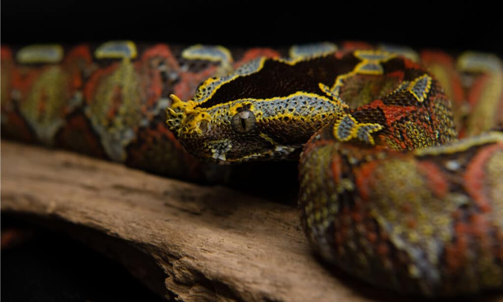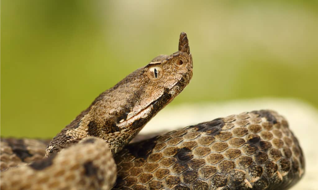 نمای نزدیک از افعی شاخ بینی زن. قابل توجه ترین نکته در مورد این مار شاخ گوشتی بالای پوزه آن است.