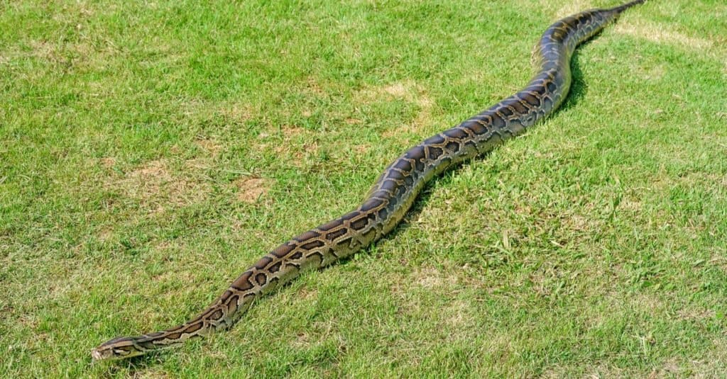 پایتون برمه ای روی چمن ها دراز شده است.