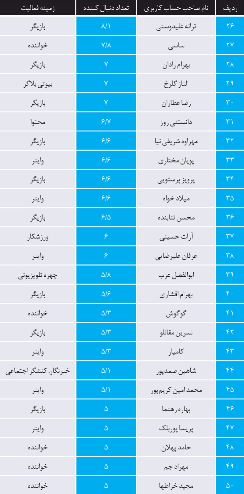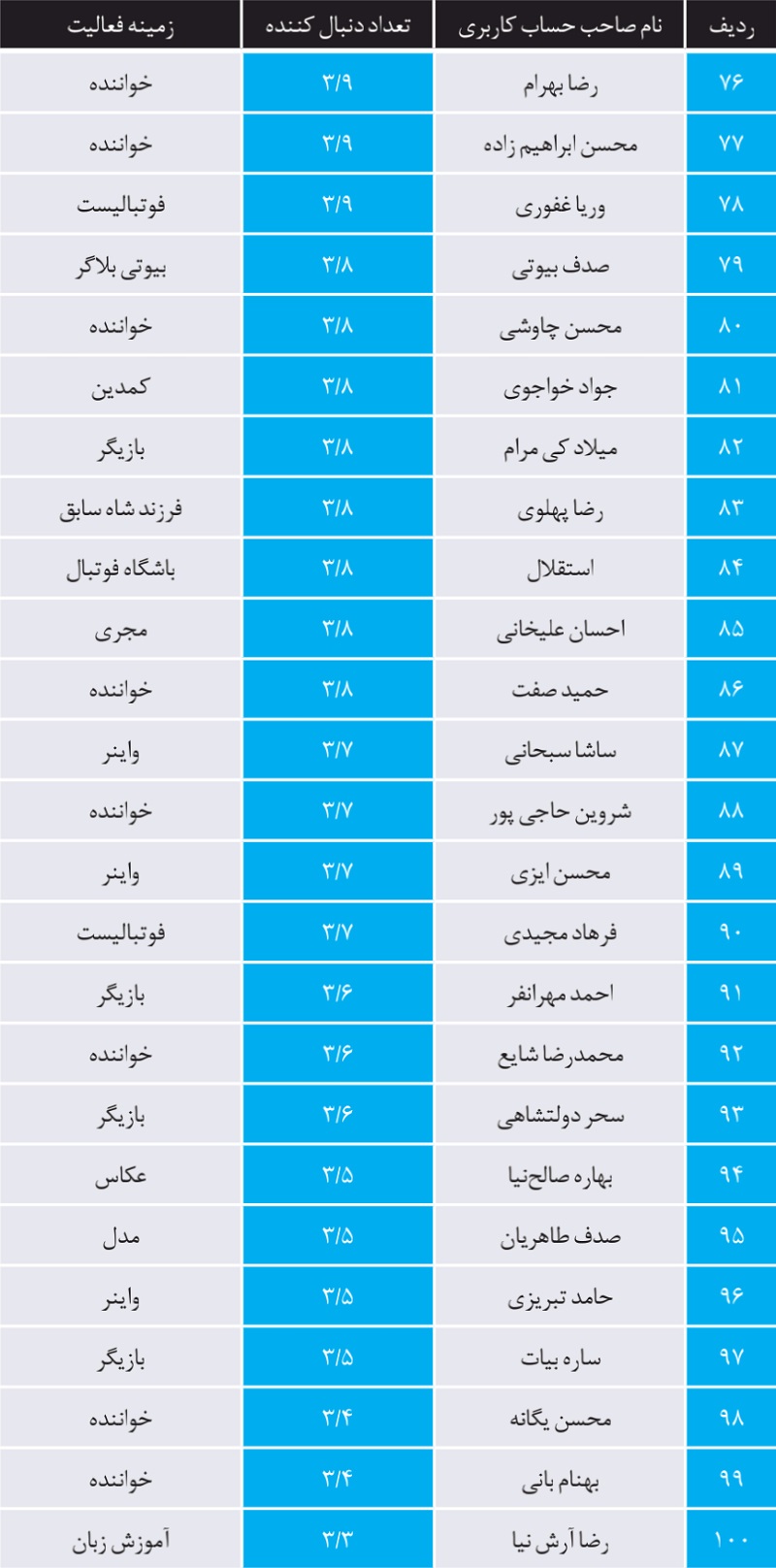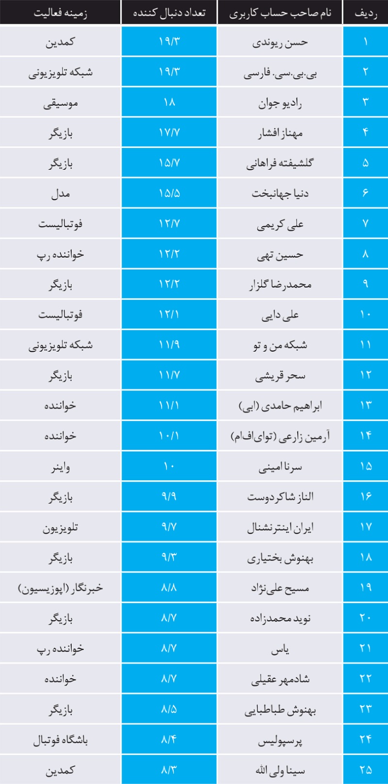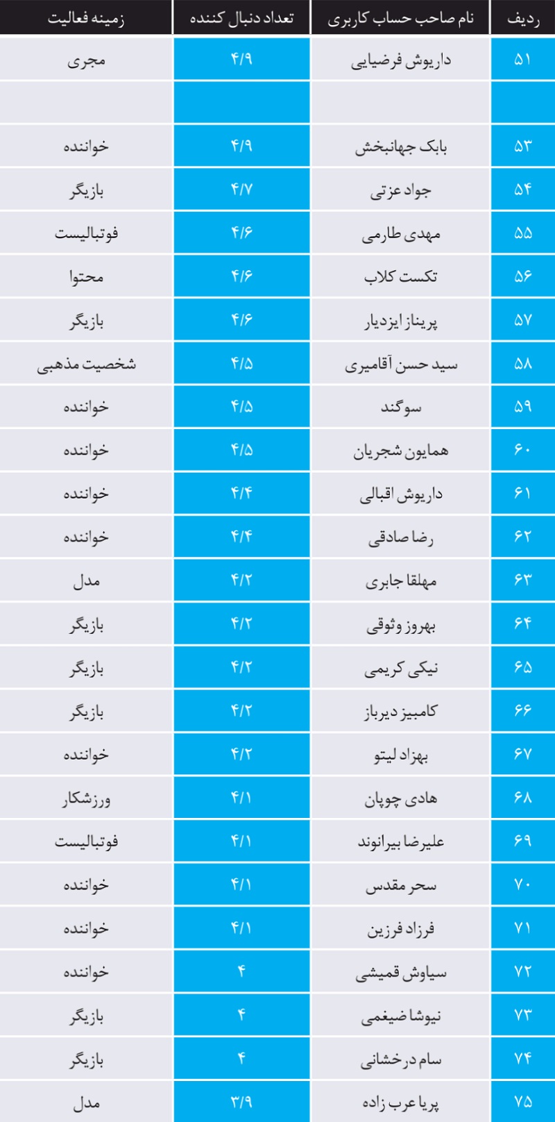 ۱۰: عجایب فهرست: فهرستمان عجایبی هم دارد. مثلا یک صفحه بهنام دانستنی روز که پرایوت هم هست (یعنی دنبال کردن آن با درخواست ممکن است) با ۷/۶ میلیون دنبالکننده در رده سیویکم قرار دارد و یک صفحه دیگر بهنام تکستکلاب با ۶/۴ میلیون دنبالکننده در جای ۵۶ قرار گرفته است. آرات حسینی احتمالا جوانترین عضو فهرست ماست با ۱۰ سال سن، ابوالفضل عرب، یک بدمن سابق بوده که بعد از حضور در چند برنامه تلویزیونی و تعریف کردن داستان تحول خود مورد توجه قرار گرفته است، در فهرست دو خبرنگار داریم که یکی مسیح علینژاد است از اپوزیسیون و دیگری شاهین صمدپور که خبرنگار داخل کشور است، دو شخصیت مذهبی در این فهرست وجود دارد که یکی آیتالله خامنهای رهبر انقلاب است و دیگری سیدحسن آقامیری و البته که یک عکاس و یک معلم زبان هم در این فهرست وجود دارد. رتبه برخی افراد در این فهرست هم عجیب است. مثلا عجیب نیست که آرمین توایافام، از یاس بیشتر دنبالکننده دارد؟ یا مثلا عجیب نیست که میزان دنبالکنندگان خانم نسرین مقانلو از خانم نیکی کریمی بیشتر است؟ برخی مسایل هم هست که البته نشان میدهد کمی با ابتذال سلیقه در اینستاگرام هم روبهرو هستیم. مثلا میزان طرفداران خوانندهای مثل حامد پهلان.