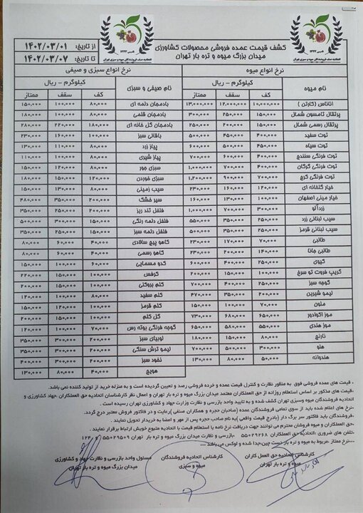 قیمت عمده فروشی محصولات کشاورزی برای هفته جاری (اول تا هفتم خرداد) از سوی بزرگ میوه و تره بار تهران اعلام شد. تنوع میوهها در فصل گرم سال بیشتر از فصل سرما است.