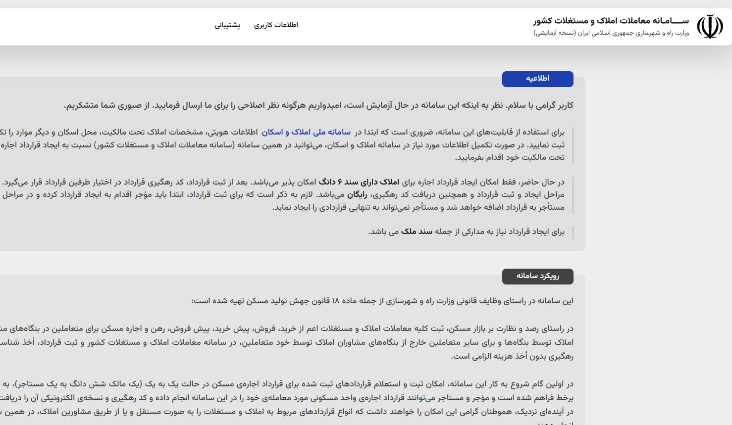 پیشتر سامانه املاک و مستغلات خدمات ثبت قرارداد اجاره مسکن و کدرهگیری را به صورت آزمایشی ارائه میداد، اما از فردا سوم خرداد ماه ارائه این خدمات به صورت رسمی و رایگان صورت میپذیرد.