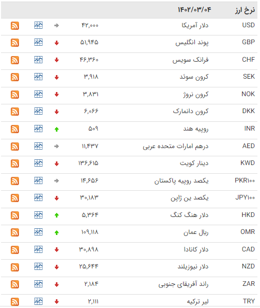 بانک مرکزی امروز، پنج شنبه 4 خردادماه ۱۴۰۲، نرخ رسمی ۴۶ ارز را اعلام کرد که بر اساس آن نرخ 12 ارز افزایش و نرخ 26 ارز کاهش یافت، نرخ باقی ارزها ثابت ماند.