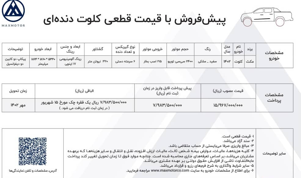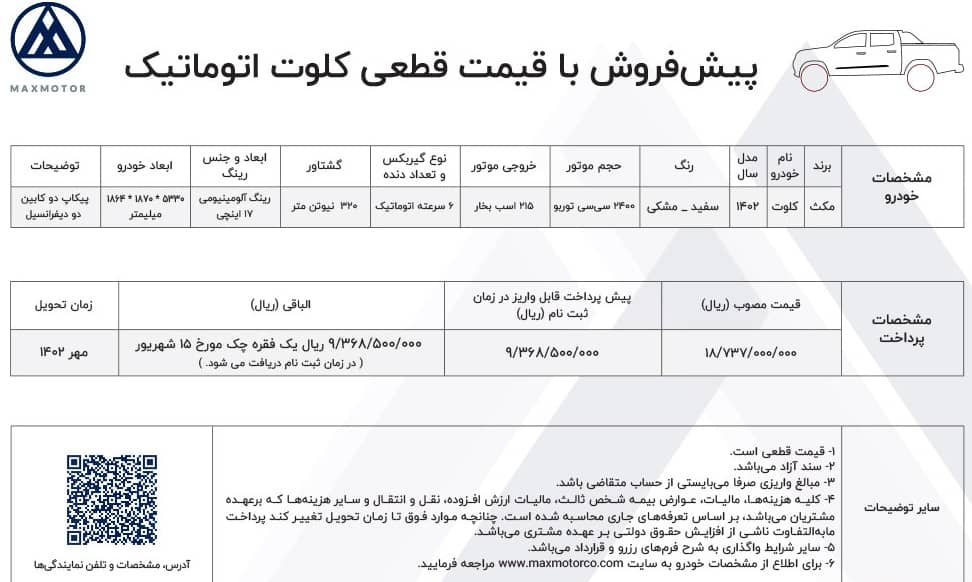 شرکت مکث موتور در این طرح نسخه دندهای پیکاپ کلوت را با قیمت مصوب ۱ میلیارد و ۵۹۶ هزار و ۷۰۰ تومان و پیشپرداخت ۷۹۸ میلیون و ۳۵۰ هزار تومان به مشتریان عرضه میکند. در این طرح نسخه اتوماتیک پیکاپ کلوت نیز با قیمت مصوب ۱ میلیارد و ۸۷۳ میلیون و ۷۰۰ هزار تومان با پیشپرداخت ۹۳۶ میلیون و ۸۵۰ هزار تومان عرضه میشود. موعد تحویل این خودروها نیز مهر ۱۴۰۲ خواهد بود.