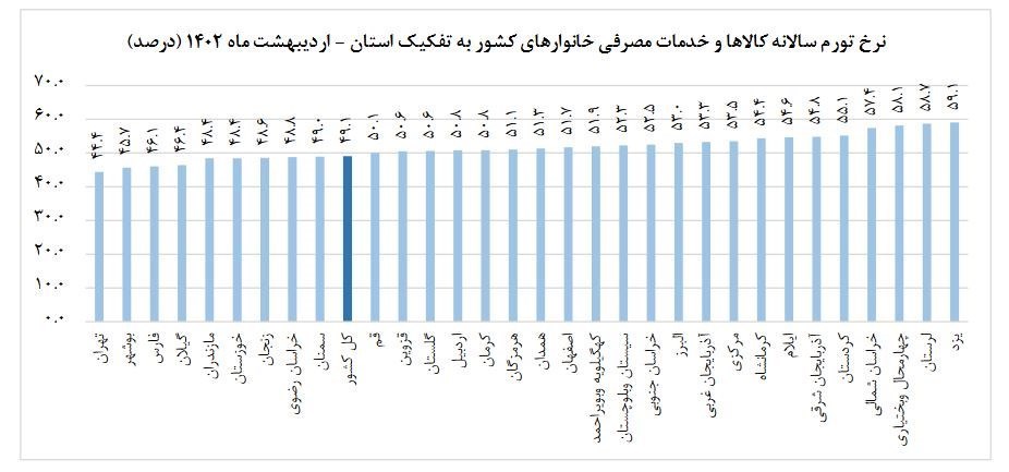 بررسی نرخ تورم در اردیبهشت ۱۴۰۲ به تفکیک ۳۱ استان کشور نشان می دهد، استان تهران با نرخ تورم ۴۴.۴ درصد پایین ترین و استان یزد با ۵۹.۱ درصد رکورددار بالاترین نرخ تورم است.