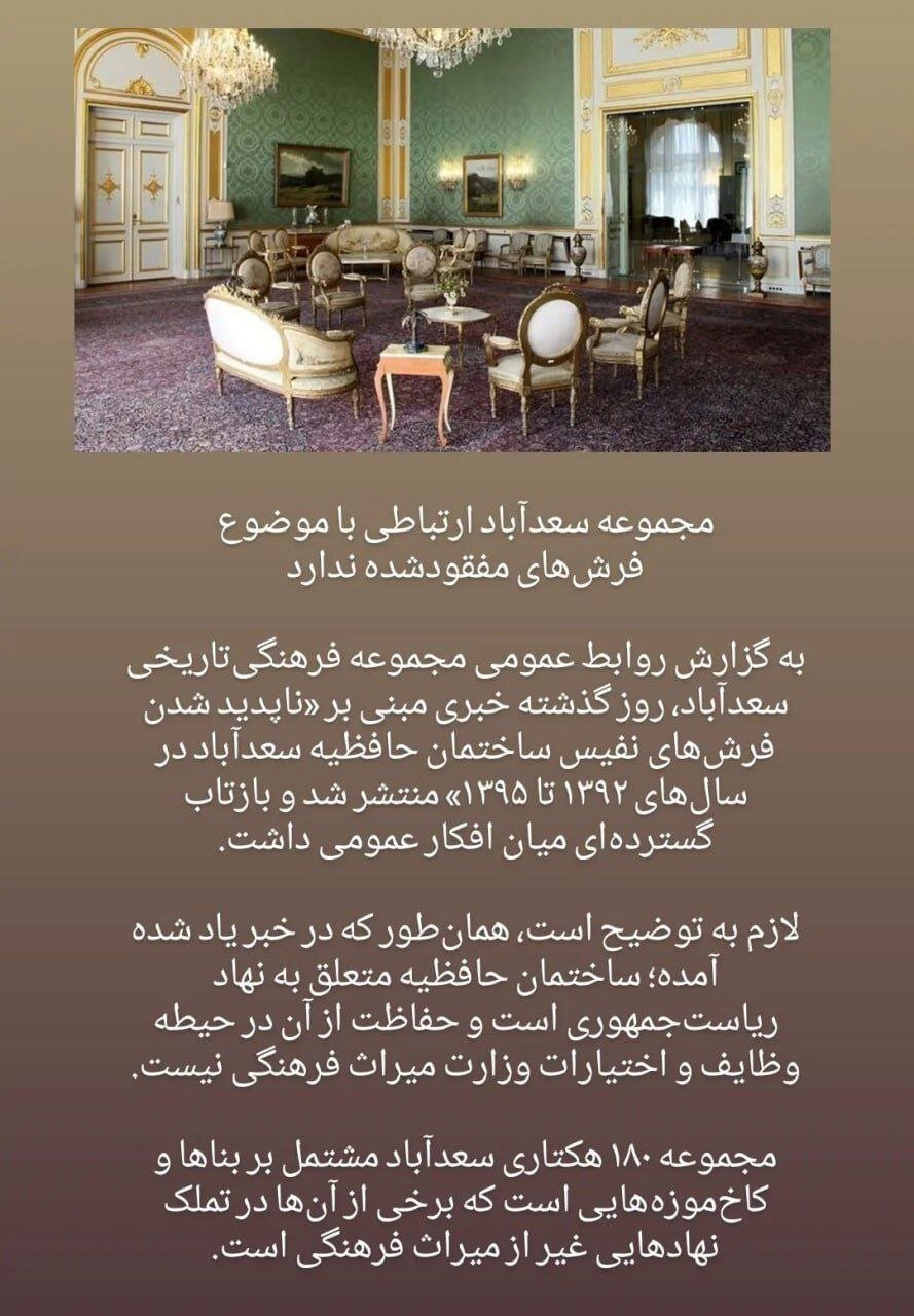 دو روز بعد؛ دو خرداد ۱۴۰۲؛ روابط عمومی کاخ سعدآباد جوابیهای نسبت به خبر مفقودی فرشهای ساختمان حافظیه کاخ سعدآباد، منتشر کرد که به شرح زیر است: روز گذشته خبری مبنی بر «ناپدید شدن فرشهای نفیس ساختمان حافظیه سعدآباد در سالهای ۱۳۹۲ تا ۱۳۹۵» منتشر شد و بازتاب گستردهای میان افکار عمومی داشت.