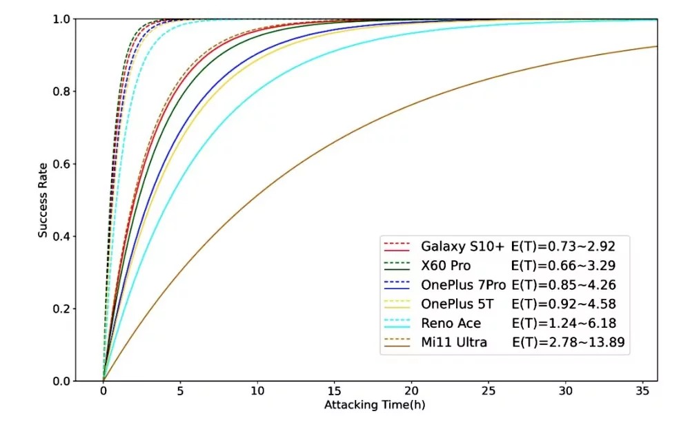 گوشیهای اندرویدی معمولاً با یکدیگر تفاوت دارند. محققان دریافتند بازکردن قفل گوشی بین ۴۰ دقیقه تا ۱۴ ساعت طول میکشد. این تیم تحقیقاتی ۱۰ گوشی مختلف را مورد آزمایش قرار داد که از میان آنها، قفل گلکسی S10 پلاس، زودتر از سایر مدلها (بین ۰٫۷ تا ۲٫۹ ساعت) باز شد. بازکردن قفل شیائومی Mi 11 اولترا با این روش بین ۲٫۷۸ تا ۱۳٫۸۹ ساعت طول کشید اما محققان موفق نشدند حسگر اثرانگشت دومدل آیفون را دور بزنند زیرا سیستمعامل iOS اطلاعات این حسگر را رمزنگاری میکند، درحالیکه اندروید اینکار را انجام نمیدهد.