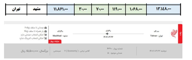 همچنین در مسیر تهران - مشهد سقف قیمت بلیت یک میلیون و ۳۱۴ هزار تومان در نظر گرفته شده، اما برخی شرکت‌ها بلیت را با نرخ یک میلیون و ۵۵۰ هزار تومان می‌فروشند.