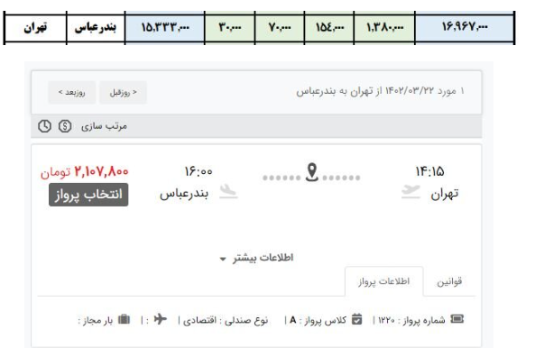 مثال دیگری از رعایت نشدن نرخ بلیت مربوط به مسیر تهران - بندرعباس است؛ در حالی که حداکثر نرخ مصوب این مسیر، یک میلیون و ۶۹۶ هزار تومان است، در برخی ایرلاین‌ها، این سقف رعایت نشده و تا دو میلیون و ۱۰۷ هزار تومان هم می‌توان برای این مسیر پروازی بلیت پیدا کرد.