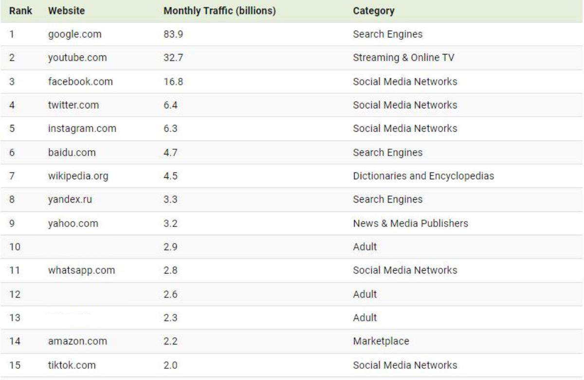 در سال ۲۰۲۳، آلفابت و فیسبوک مانند سالهای متمادی در راس فهرست پربازدیدترین وبسایت های جهان قرار دارند. در واقع، وقتی گوگل، یوتیوب، فیسبوک، اینستاگرام و واتساپ با هم ترکیب میشوند، سه چهارم از کل ترافیک فهرست ۲۵ برتر را به خود اختصاص میدهند.
