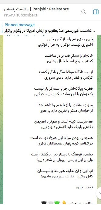 همزمان با تنش تهران و کابل که دیروز با نبرد نظامی طرفین نیز همراه شد، کانال افغانستانی و ضدطالبان «مقاومت پنجشیر»، شعری پرمعنا منتشر کرد.