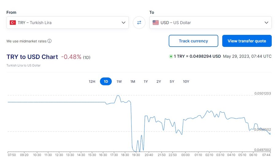همچنین نسبت لیر به دلار ایالات متحده دقیقا از آغازین لحظههای انتشار گمانهزنیهای پیروزی رجب طیب اردوغان، روند نزولی داشت و تا این ساعت حدود نیم درصد کاهش داشته است. همزمان با آغاز هفته معاملاتی جدید، لیر ترکیه در قیمت ۲۰.۰۵ در برابر دلار باز شد، نه چندان دور از رکورد ۲۰.۰۶ در روز جمعه. لیر که مستعد نوسانات شدید قبل از ساعات عادی معاملات است، از ابتدای سال تاکنون بیش از ۶ درصد تضعیف شده و بیش از ۹۰ درصد ارزش خود را در دهه گذشته از دست داده است.