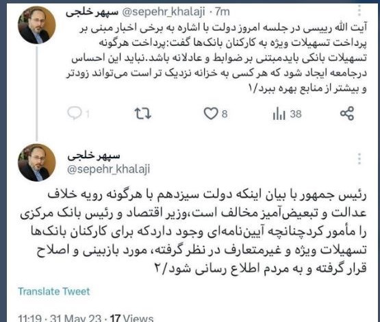 وی افزود: رئیس جمهور با بیان اینکه دولت سیزدهم با هرگونه رویه خلاف عدالت و تبعیضآمیز مخالف است، وزیر اقتصاد و رئیس بانک مرکزی را مأمور کرده چنانچه آییننامهای وجود دارد که برای کارکنان بانکها تسهیلات ویژه و غیرمتعارفی در نظر گرفته، مورد بازبینی و اصلاح قرار گرفته و به مردم اطلاعرسانی شود.