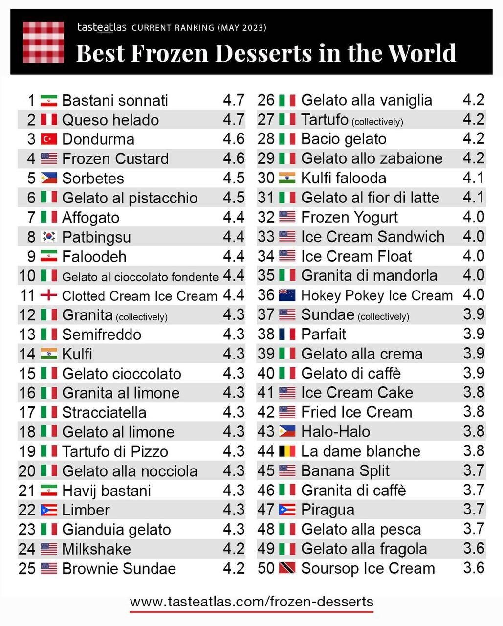 برای تشکیل فهرستی از محبوبترین دسرهای سرد در سراسر جهان، ۴۴۲۶ نظر در سایت TasteAtlas به ثبت رسید که از این تعداد، ۳۳۸۶ موردتأیید سیستم بود. این سایت، یک اطلس جهانی در زمینه غذا است؛ پروژهای که به معرفی برترین غذاهای محلی و حتی ارائه دستور تهیه آنها اختصاص دارد.