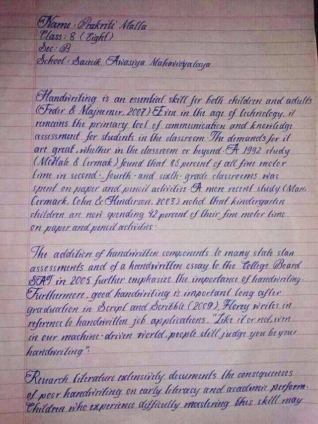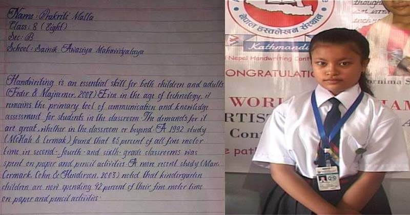 «پراکریتی مالا» زیباترین دستخط جهان را دارد. او در سال 2017 در نپال دانشجوی استاندارد 8 بود، زمانی که مقاله او در رسانه های اجتماعی منتشر شد. این دختر نپالی از کانون توجه روزنامهاش در حسابهای فیسبوک، توییتر و ردیت بیاطلاع بود که باعث تعجب والدین و بستگانش شد. او مانند یک فونت طراح روی کامپیوتر می نویسد. او با این کار خوشنویسی (هنر خوشنویسی) را وارد مرحله جدیدی کرده است.