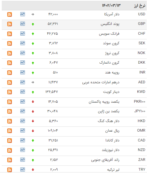 بانک مرکزی امروز، شنبه 13 خرداد ۱۴۰۲، نرخ رسمی ۴۶ ارز را اعلام کرد که بر اساس آن نرخ 21 ارز افزایش و نرخ 16 ارز کاهش یافت، نرخ باقی ارزها ثابت ماند.