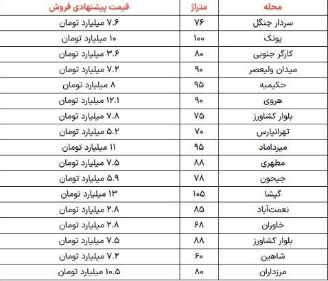 یک واحد مسکونی دوبلکس ۱۲۵ متری واقع در آجودانیه با قیمت ۱۵ میلیارد تومان (هر مترمربع ۱۲۰ میلیون تومان)، آپارتمان ۸۵ متری در ازگل با قیمت ۹.۵ میلیارد تومان، واحد مسکونی ۹۵ متری واقع در سازمان برنامه با قیمت ۱۲.۵ میلیارد تومان، آپارتمان ۹۲ متری در دولتآباد با قیمت ۵.۵ میلیارد تومان، آپارتمان ۱۰۰ متری ۴ سال ساخت در شریعتی با قیمت ۱۲.۱ میلیارد تومان (قیمت هر متر مربع ۱۲۱ میلیون تومان)، واحد مسکونی نوساز ۸۸ متری واقع در پونک با قیمت هر متر ۱۱۶ میلیون تومان و واحد ۹۰ متری در بلوار فردوس با قیمت ۸.۸ میلیارد تومان در فایل فروش قرار گرفته است.