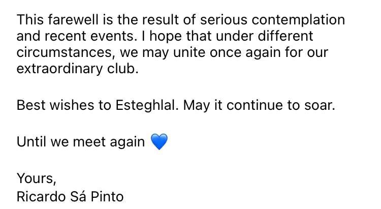 از تکتک شما هواداران، بازیکنان و حامیان تشکر میکنم. متأسفانه به دلیل شرایط فعلی مدیریت باشگاه، ادامه کار را غیرممکن میبینم. این خداحافظی نتیجه تأمل جدی و اتفاقات اخیر است. امیدوارم در شرایط مختلف بتوانیم یک بار دیگر برای باشگاه فوقالعاده خود متحد شویم. با آرزوی موفقیت برای استقلال؛ باشد که به اوجگیری خود ادامه دهد تا اینکه دوباره همدیگر را ببینیم.