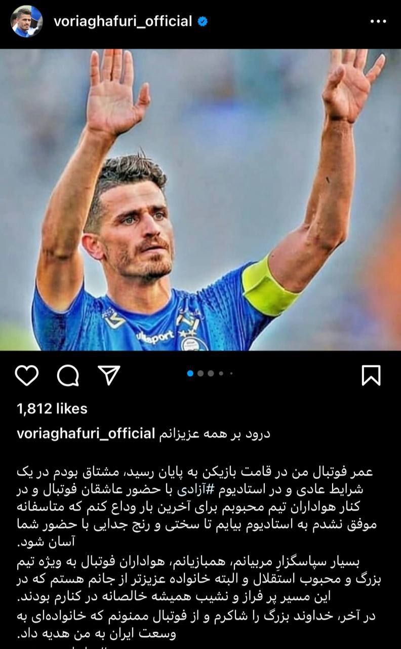 وریا غفوری درباره حواشی غیبش در روز دربی برای خداحافظی رسمی با هواداران استقلال نوشت: مشتاق بودم در یک شرایط عادی و در استادیوم آزادی با حضور عاشقان فوتبال و در کنار هواداران تیم محبوبم برای آخرین بار وداع کنم که متاسفانه موفق نشدم به استادیوم بیایم!