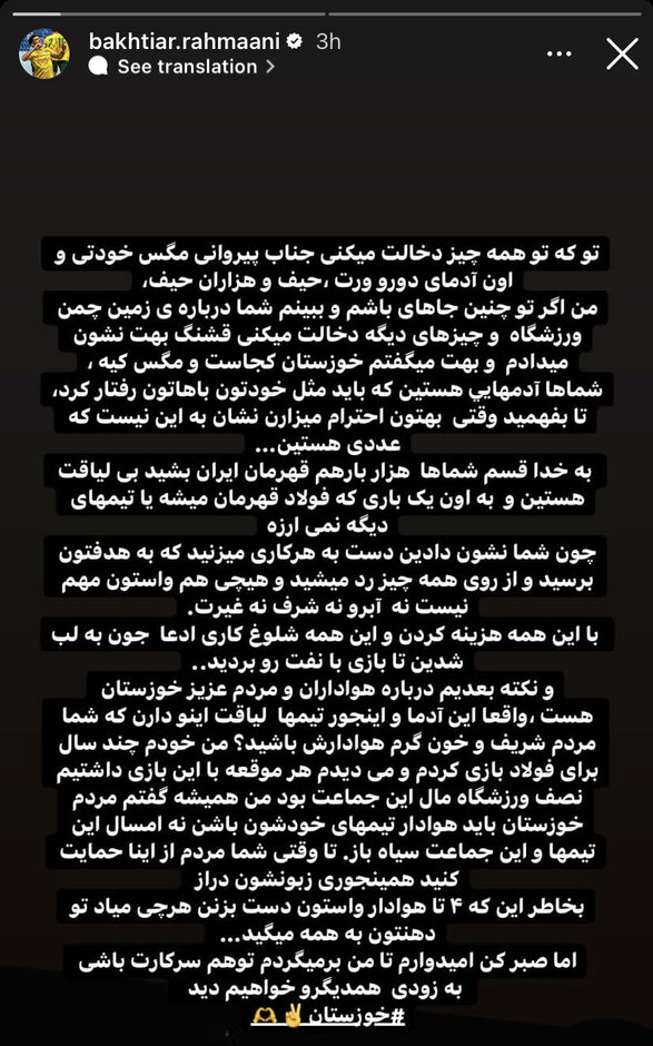 پس از دیدار پرسپولیس مقابل نفت مسجدسلیمان در شهریور سال ۱۴۰۱ و حواشی که در این بازی به وجود آمد بختیار رحمانی بازیکن اسبق استقلال که سابقه حضور در تیمهای خوزستانی را دارد در اینستاگرام خود با انتشار یک استوری حمله تند و عجیبی به افشین پیروانی انجام داد و او را تهدید به برخورد کرد.