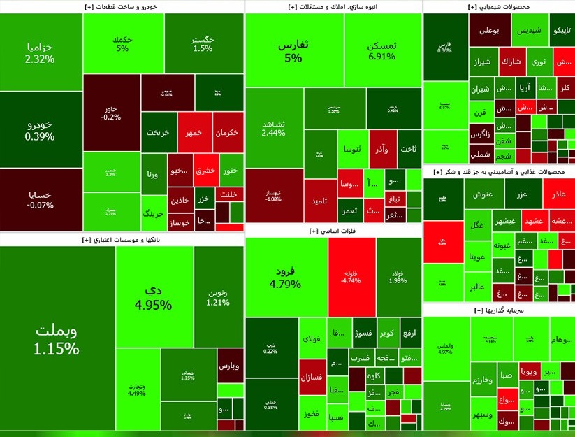 به گزارش سایت طلا،شاخص کل بورس امروز با ۹۷۵۰ واحد افزایش تا رقم دو میلیون و ۱۵۵ هزار واحد صعود کرد. شاخص کل با معیار هم وزن نیز با افزایشی ۶۶۶ واحدی در رقم ۷۳۰ هزار و ۴۱۲ واحد ایستاد. در این بازار ۵۳۲ هزار معامله به ارزش ۶۳ هزار و ۷۹۵ میلیارد ریال انجام شد. ۵۹ درصد نمادهای بورسی مثبت بودند که از میان آنها فولاد مبارکه اصفهان، گروه مپنا و پالایش نفت بندرعباس نسبت به سایر نمادها بیشترین تاثیر مثبت را روی بورس گذاشتند.