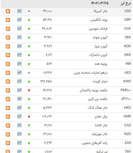 بانک مرکزی امروز، پنج شنبه 25 خرداد ۱۴۰۲، نرخ رسمی ۴۶ ارز را اعلام کرد که بر اساس آن نرخ 14 ارز کاهش و نرخ 24 ارز افزایش یافت، نرخ باقی ارزها ثابت ماند.