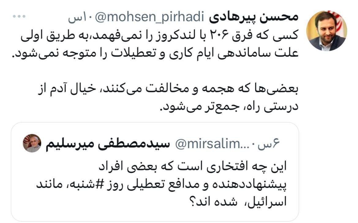 پیرهادی نماینده مجلس به مخالفت میرسلیم با تعطیلی شنبهها نوشت: کسی که فرق ۲۰۶ با لندکروز را نمیفهمد، علت ساماندهی ایام کاری و تعطیلات را متوجه نمیشود!