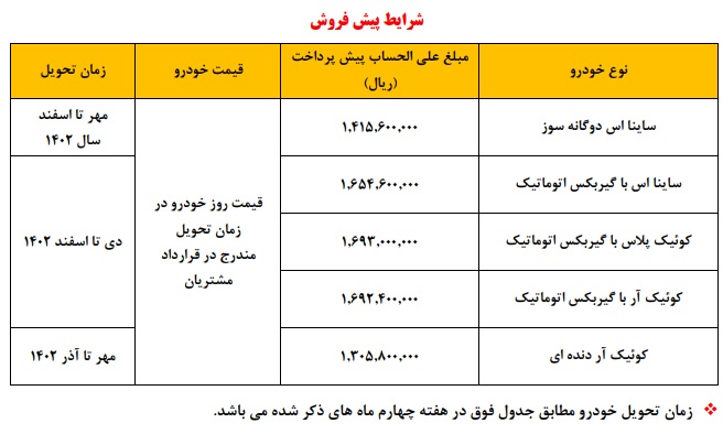 پیرو اعلام نتایج در دومین طرح سامانه یکپارچه تخصیص خودرو به اطلاع نمایندگی ها و متقاضیان حائز شرایطی که در طرح عادی سامانه یکپارچه عرضه خودرو در خرداد ماه سال جاری نسبت به پیش ثبت نام محصولات اقدام نموده و خودروی انتخابی ایشان جهت خودروی ساینا اس دوگانه سوز با اولویت پاییز و زمستان ،1402 ساینا اس با گیربکس اتوماتیک و کوئیک با گیربکس اتوماتیک و کوئیک آر با گیربکس اتوماتیک با اولویت زمستان 1402 و همچنین کوئیک آر دنده ای با اولویت پاییز 1402 تایید شده و در تاریخ 1402/03/25 پیامک به ایشان ارسال گردیده می رساند، امکان واریز وجه خودرو و ثبت نام مطابق شرایط ذیل اعلام می گردد.