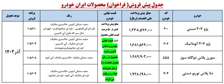 شرایط پیش فروش (فراخوان) برخی از محصولات شرکت ایران خودرو صرفأ جهت بخش سوم اولویت های پاییز 1402 با موعد تحویل آذر 1402 به شرح ذیل اعلام می گردد.
