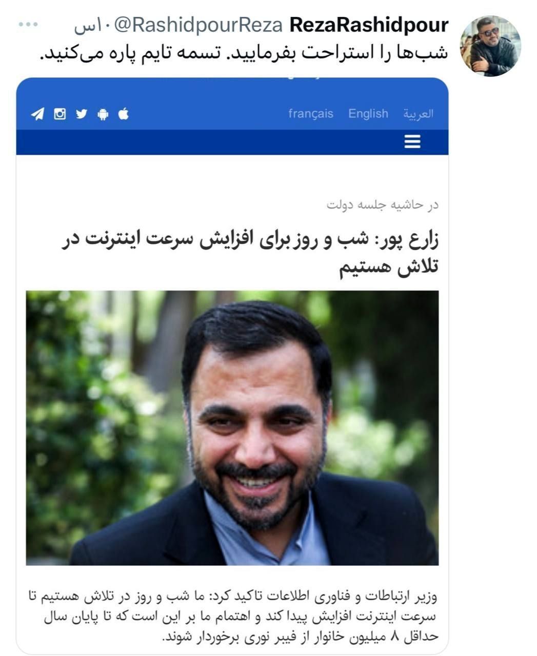 رضا رشیدپور در واکنش به اظهارات زارع‌پور، وزیر ارتباطات درباره تلاش شبانه‌روزی برای افزایش سرعت اینترنت نوشت: شب ها را استراحت بفرمایید. تسمه تایم پاره می‌کنید