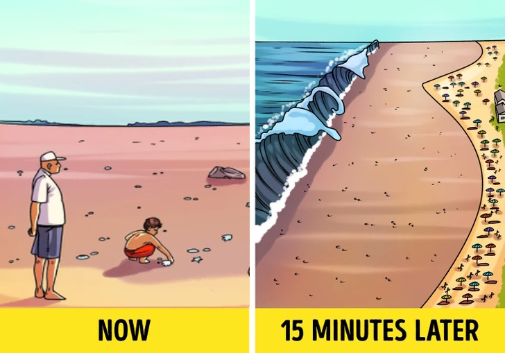 هنگامی که خط آب بهطور غیرعادی از ساحل دور است، نشانه سونامی است. اگر در جایی متوجه این موضوع شدید، باید به همه اطرافیان هشدار دهید و فرار کنید.