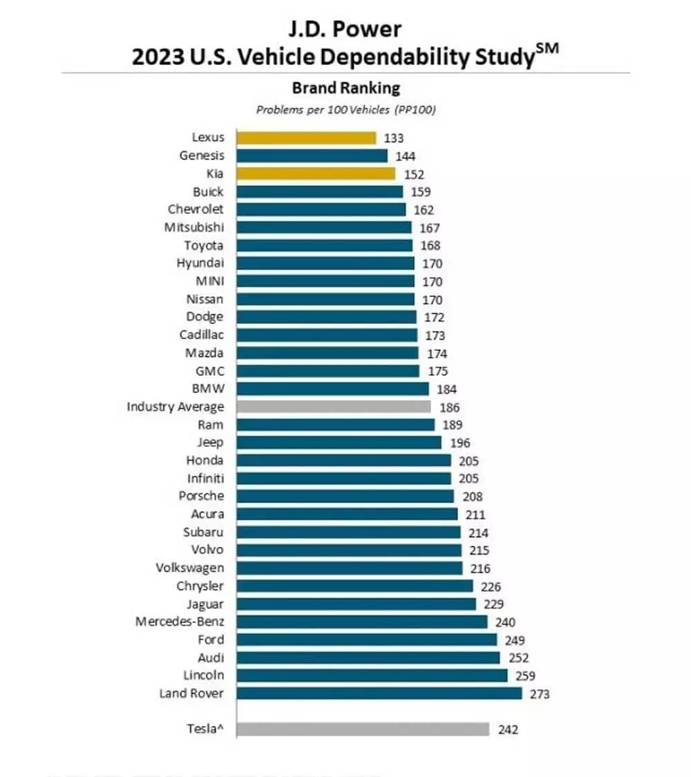 موسسه جیدی پاور هر ساله لیست غیرقابل اعتمادترین خودروسازان جهان را با نظرسنجی از هزاران مالک خودرو تهیه و منتشر میکند. برای تهیه این لیست فقط از کسانی که نخستین مالک خودرو بودند و به مدت 3 سال از آنها استفاده کردند، نظرسنجی میشود. در ادامه نیز کارشناسان، مشکلات در هر 100 دستگاه خودرو را با اختصار PP100 تعیین میکنند که هرچه این رقم کمتر باشد، بهتر است.
