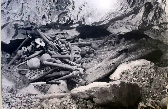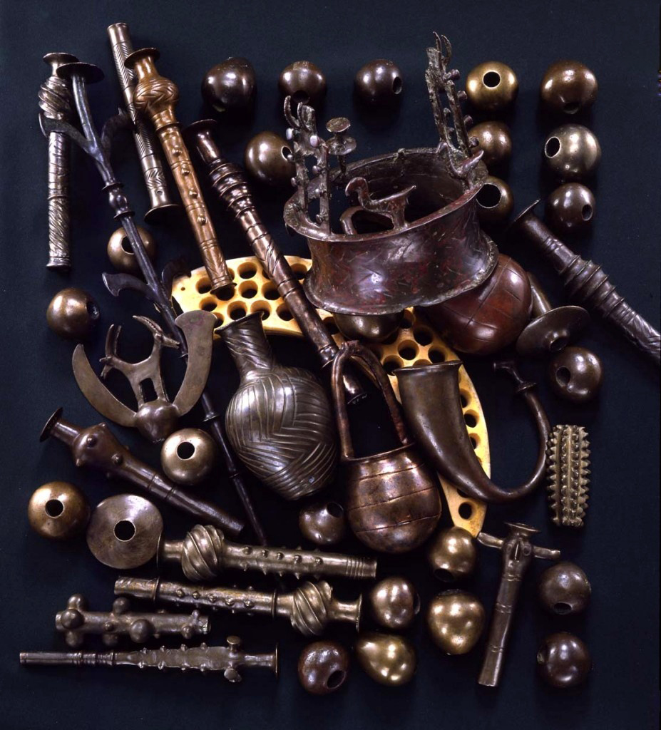 اشیاء این گنجینه که طبق نظر باستانشناسان با عجله و شتاب جمعآوری و پنهان شده بودند، شامل تعداد زیادی عصای تزئینی، سرهای فلزی کوپال (نوعی چماق)، تعدادی ظرف، چند سلاح و همینطور چند تاج میشد.