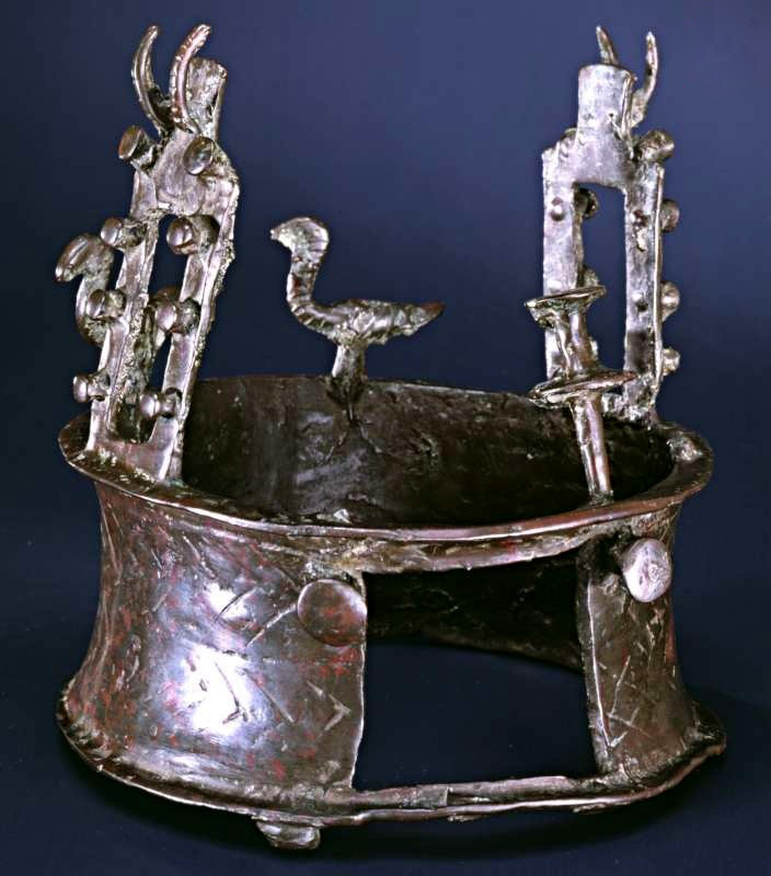 یکی از این تاجها شبیه به یک حلقۀ ضخیم برنزی است که تمثالهایی رازآلود از دو کرکس و دو دروازه در قسمت بالای آن قرار دارد. این تمثالها میتوانند پیوند این شیء با آیینهای تدفین و ارتباط با دنیای بعد از مرگ را نشان بدهند.