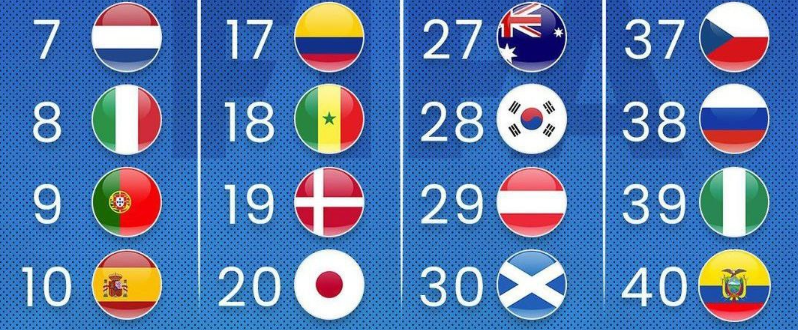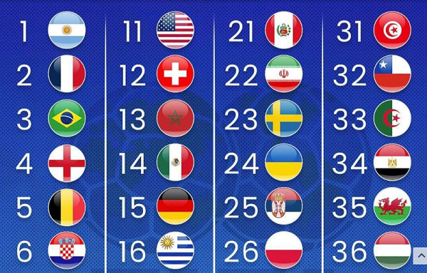 در ردهبندی ۱۰ تیم برتر جهان، آرژانتین همچنان صدرنشین است و جایگاه تیمهای برزیل و فرانسه هم دستنخورده باقی مانده است. انگلیس و کرواسی هر کدام یک پله صعود و بلژیک و هلند هم یک رتبه نزول کردهاند. رتبههای ایتالیا، پرتغال و اسپانیا هم تغییری نکرده است.