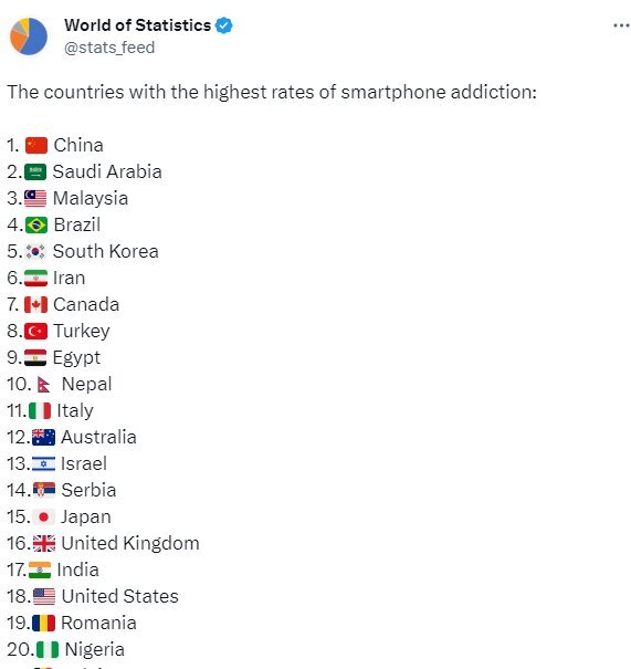 اکانت World of Statistics در توئیتر با انتشار جدولی فهرست کشورهایی با بیشترین میزان اعتیاد به گوشی هوشمند را منتشر کرده است.