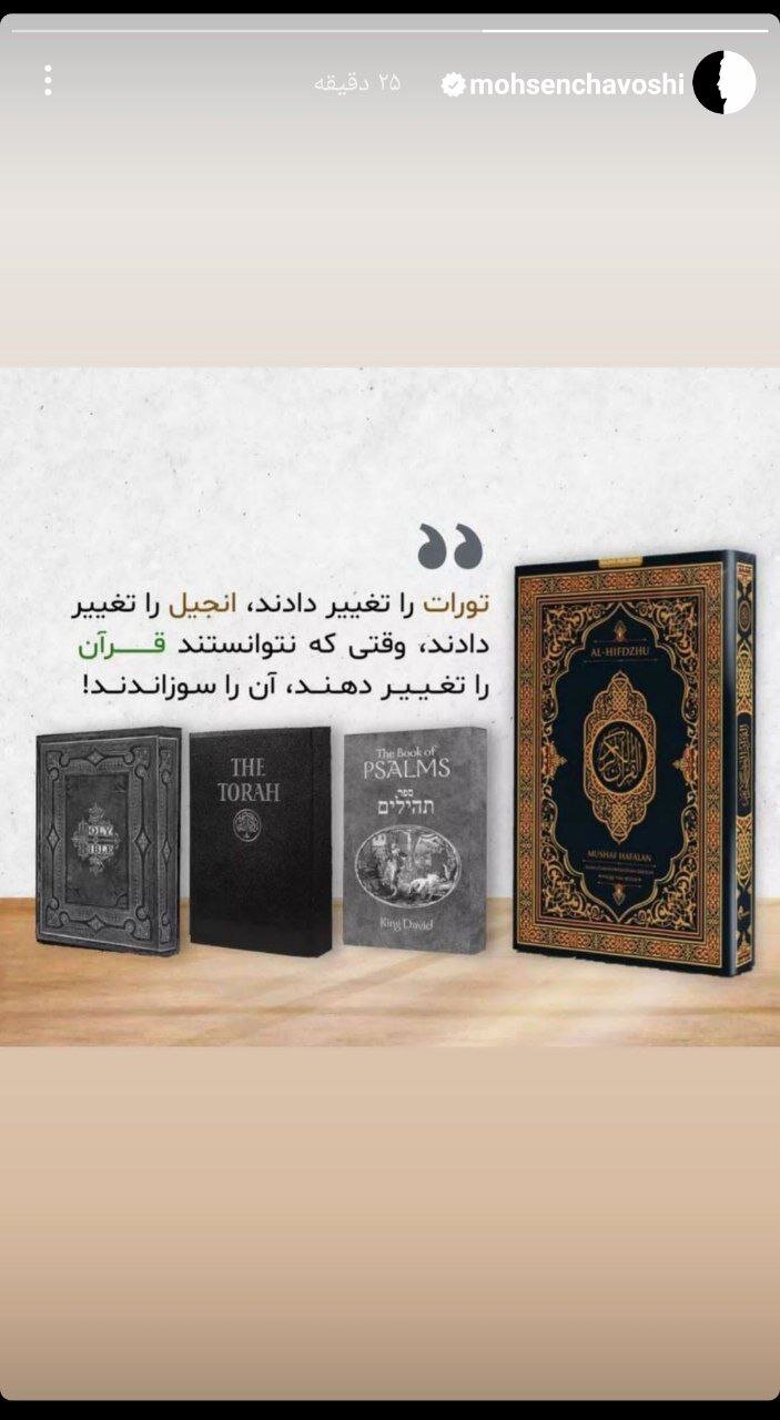 حالا و در واکنش به این اتفاق، محسن چاوشی خواننده موسیقی پاپ کشورمان واکنش نشان داده است. او با انتشار عکسی در صفحه شخصیاش نوشت: تورات را تغییر دادند، انجیل را تغییر دادند، وقتی که نتوانستند قرآن را تغییر دهند، آن را سوزاندند!