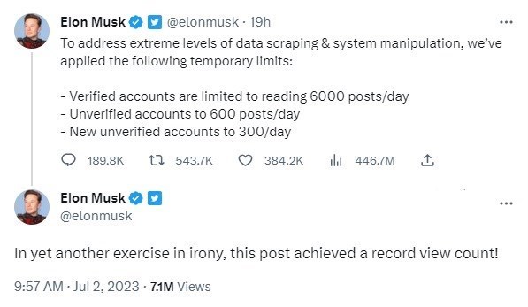ایلان ماسک، مالک میلیارد آمریکایی توییتر، در توییتی عنوان کرد که حساب‌های تایید شده توییتر روزانه فقط می‌توانند ۶۰۰۰ پست را بخوانند و حساب‌های تایید نشده قدیمی به ۶۰۰ پست در روز و حساب‌های تایید نشده جدید به ۳۰۰ پست در روز محدود می‌شوند.