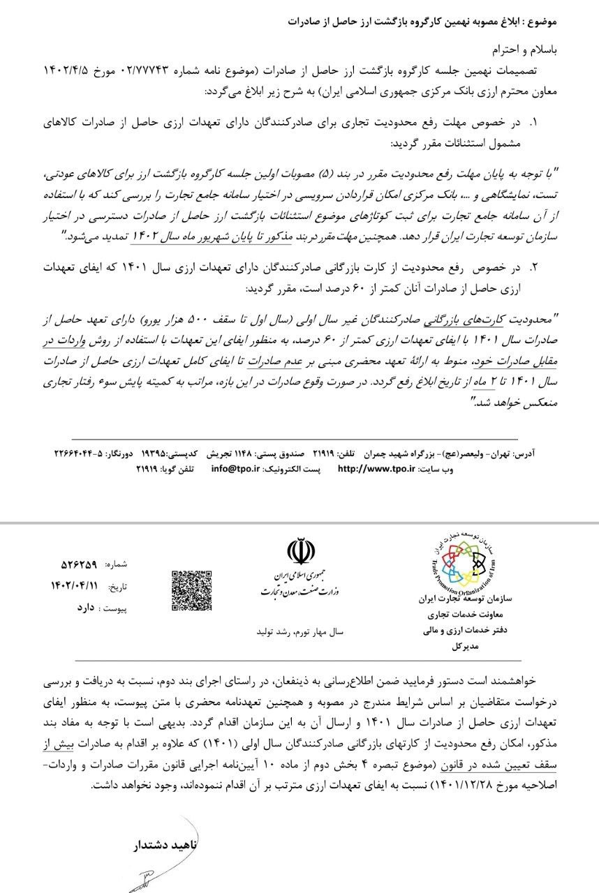 در این ابلاغیه آمده است: تصمیمات نهمین جلسه کارگروه بازگشت ارز حاصل از صادرات موضوع نامه شماره ۲/۷۷۷۴۳ مورخ ۱۴۰۲/۴/۵ معاون محترم ارزی بانک مرکزی جمهوری اسلامی (ایران به شرح زیر ابلاغ میگردد.