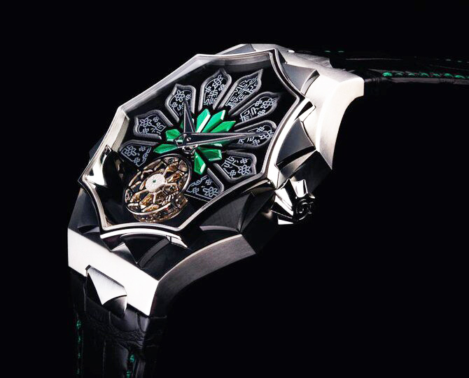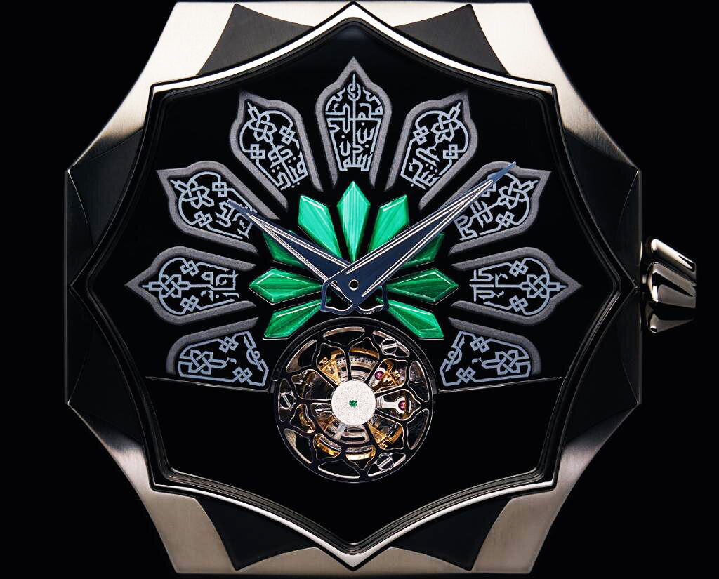 وی افزود: این همچنین نماد پرچم عربستان است. یک سنگ مالاشیت پر جنب و جوش ساعت را زینت می دهد، در حالی که چهره آن دارای عقیق سیاه براق است.