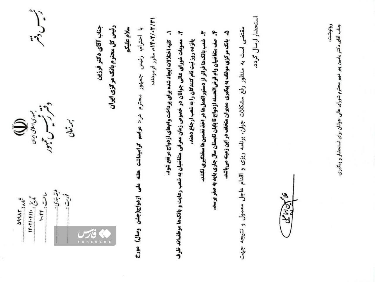 رئیس جمهور طی نامهای خطاب به رئیس بانک مرکزی دستورات ویژهای را برای تسهیل ازدواج جوانان مقرر کرد.