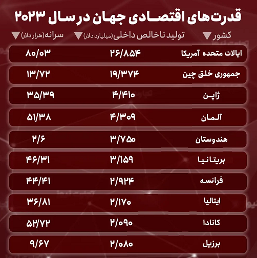 فوربز ایندیا در جدیدترین گزارش خود به بررسی 10 اقتصاد برتر جهان در سال 2023 پرداخته است. بر اساس این گزارش، ایالات متحده آمریکا همچنان جایگاه خود را به‌عنوان اقتصاد برتر جهان حفظ کرده است.