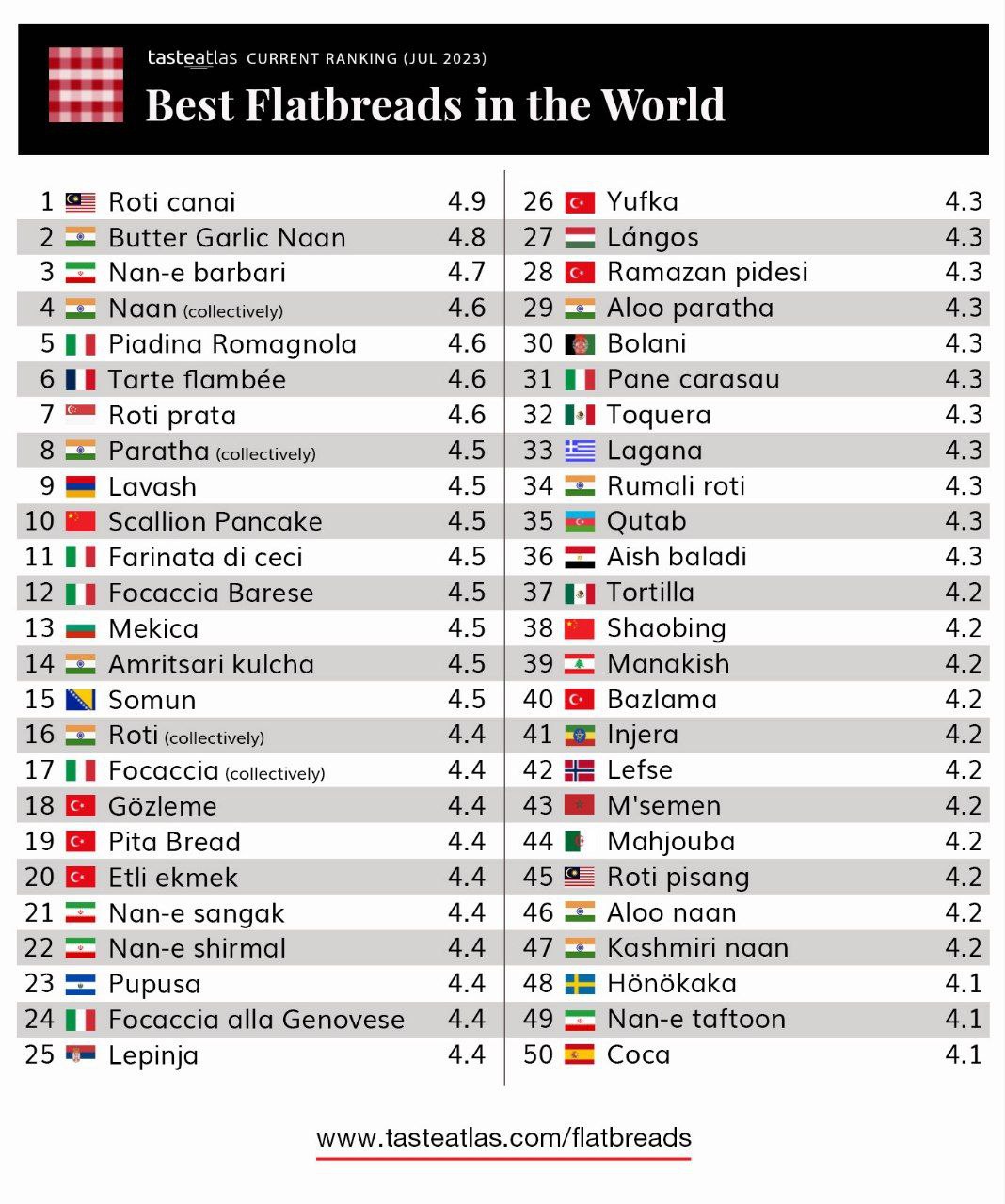 «نان بربری» در جایگاه سوم جهان، «نان سنگک»، «نان شیرمال» و «نان تافتون» بهترتیب در جایگاه بیستویکم، بیستودوم و چهلونهم برترین نانهای جهان قرار گرفتند.