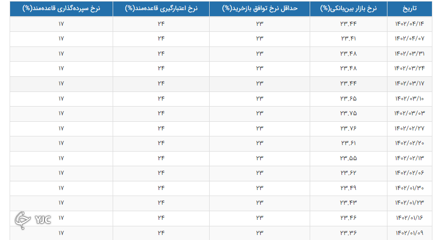 بر اساس آمار منتشرشده از سوی بانک مرکزی نرخ بهره بین بانکی در هفته منتهی به چهارشنبه ۱۴ تیر به ۲۳.۴۴ درصد رسید.