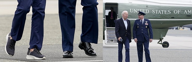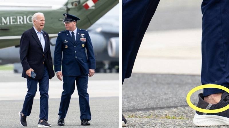 رئیس جمهور ۸۰ ساله ایالات متحده هنگام نزدیک شدن به هواپیما، پیراهن دکمه دار، کت و شلوار و کتانی پوشیده بود، اما عکاس نیویورک تایمز اشاره کرد که بایدن جوراب نپوشیده است.