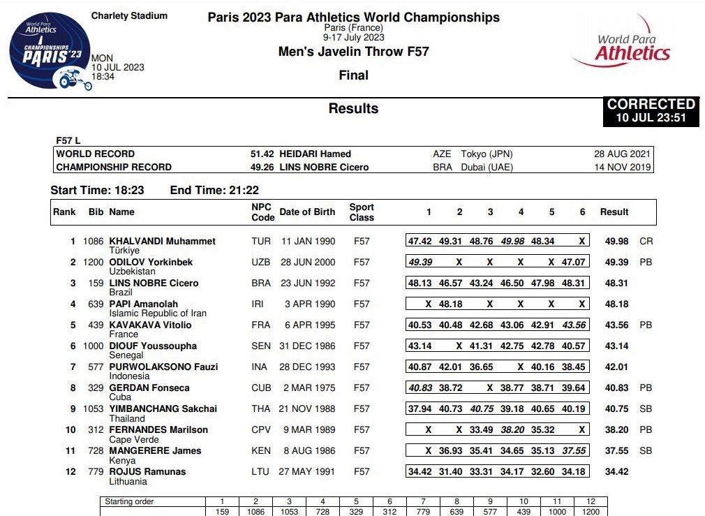 مدال طلای امانالله پاپی در رقابتهای پارادوومیدانی قهرمانی جهان از او گرفته شد.