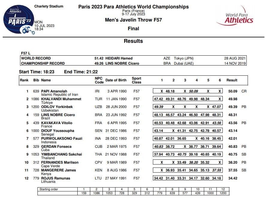 براساس همین موضوع، محمد خالوندی ورزشکاران ایرانی الاصل تیم ترکیه که سابقه کسب دو طلا برای ایران در پارالمپیک 2012 لندن و 2016 ریو را دارد، به مقام قهرمانی رسید و ورزشکاران ازبکستان و برزیل در ردههای دوم و سوم ایستادند و پاپی نیز چهارم شد، ضمن اینکه این چهار ورزشکار سهمیه پارالمپیک پاریس را نیز بهدست آوردند.