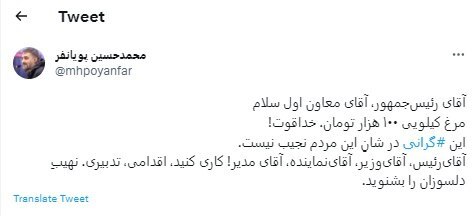 پویانفر در توییتی نوشت: آقای رئیسجمهور، آقای معاون اول! مرغ کیلویی ۱۰۰ هزار تومان. خداقوت!
