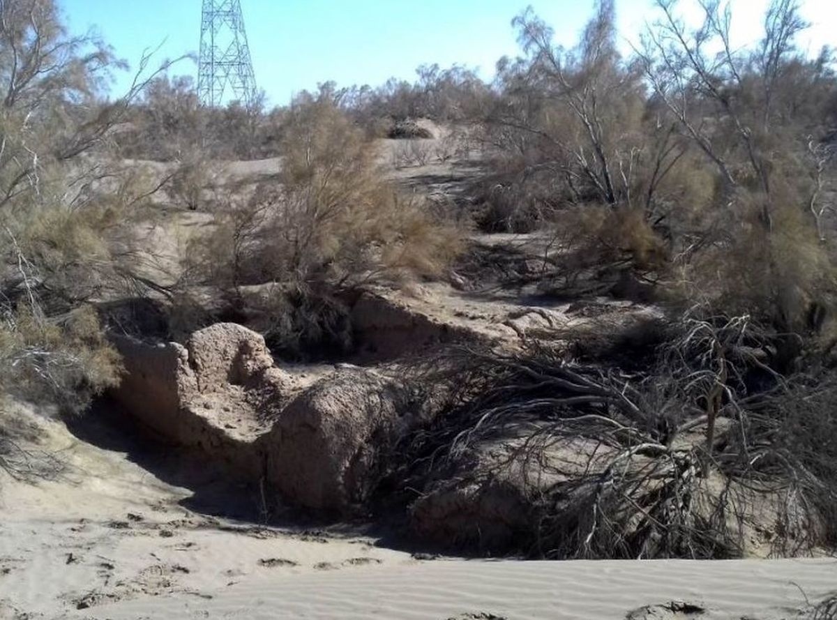این عکس (مانند عکس نمایه) بقایایی از شهر را که در اثر جابهجایی شنها آشکار شدهاند نشان میدهد