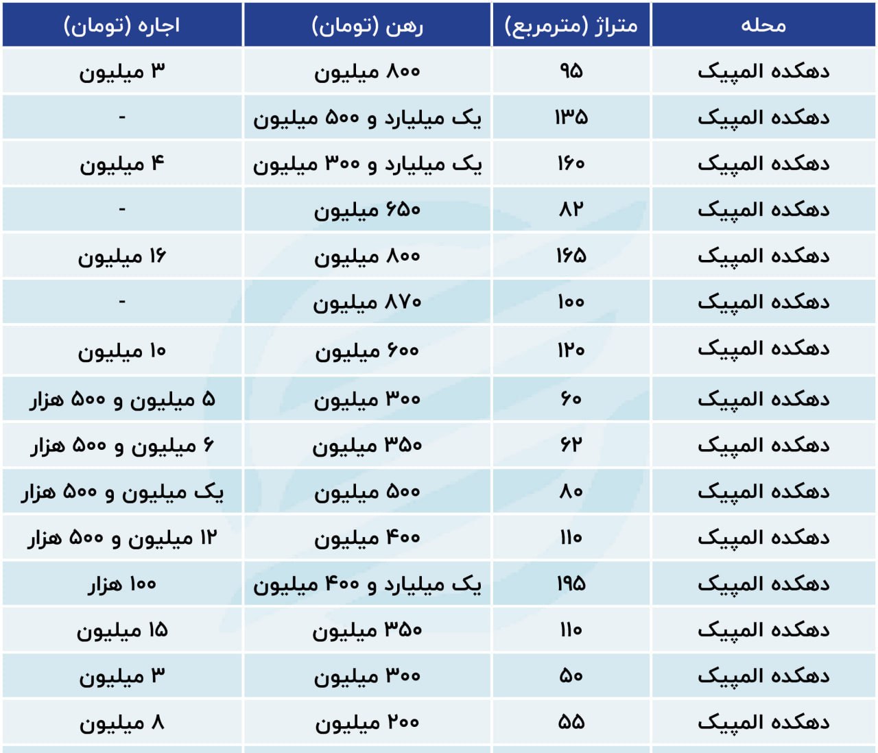 در محله دهکده المپیک، رهن واحدی با 165 مترمربع مساحت، 800 میلیون تومان و اجاره ماهانه آن 16 میلیون تومان است. برای واحدی دیگر با 120 مترمربع زیربنا، 600 میلیون تومان رهن و 10 میلیون تومان اجاره ماهانه پیشنهاد شده است. رهن کامل واحدی با 100 مترمربع زیربنا، 870 میلیون تومان و رهن کامل واحدی با 82 مترمربع مساحت، 650 میلیون تومان تعیین شده است.