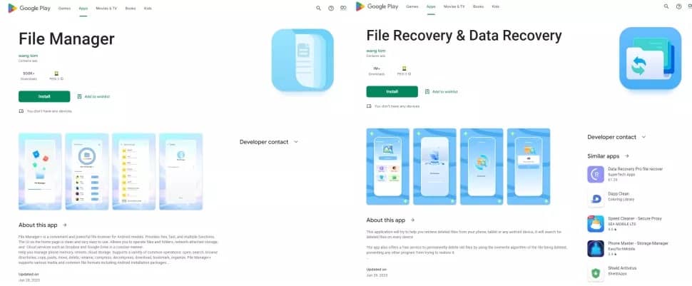 یکی از آنها، File Recovery and Data Recovery با یک میلیون دانلود و دیگری، File Manager با 500 هزار بار دانلود است.